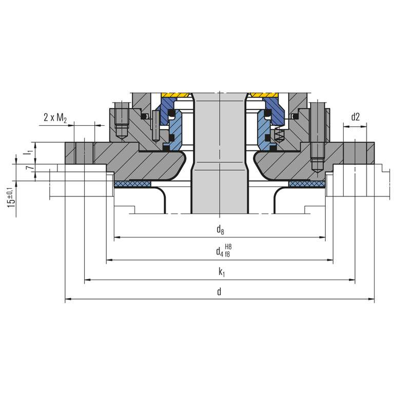 Double seal (with integrated bearing) for steel vessels to DIN 28136, connection flange to DIN 28141 and shaft ends to DIN 28154.
